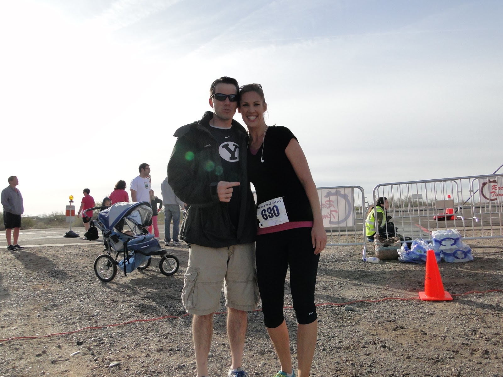 And the best part--I ran the Whole thing! I usually can't make it more than a mile or two without stopping to walk for a bit and then keep running. But not this time. The course was along a beautiful desert road so I could just get in my groove without distractions. It was so beautiful seeing the sun come up over the mountains. It is a long, steady climb the whole first half--not a steep hill, bit enough to keep me saying, "curse you darn hill" throughout the whole 6++ miles. I kept telling myself, "just make it up, and then at the turn around you can stop and walk." But as soon as I hit that turn around, I saw how much I had climbed--the view was amazing. And I thought, "if I can run up that with out stopping, surely I can run down that without stopping." And I did. Despite fatigue and bad stomach cramping at mile 10 and really yucky bowel problems at